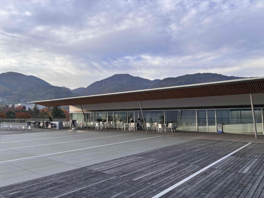 中を歩いていると、建物そのものが作品みたいだなと思う。どこを見ても窓が額縁みたいで、その先に善光寺や山並みが広がる。景色を見てるのか、作品を見てるのか、ちょっと混ざる瞬間があってそれがまた楽しい。