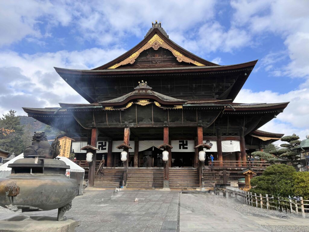 JR長野駅からバスで行くなら、善光寺口から乗って十五分ほどで大門に到着。そこから本堂まで五〜十分くらいで、参道を歩くだけで旅気分がじわっと出てくる。